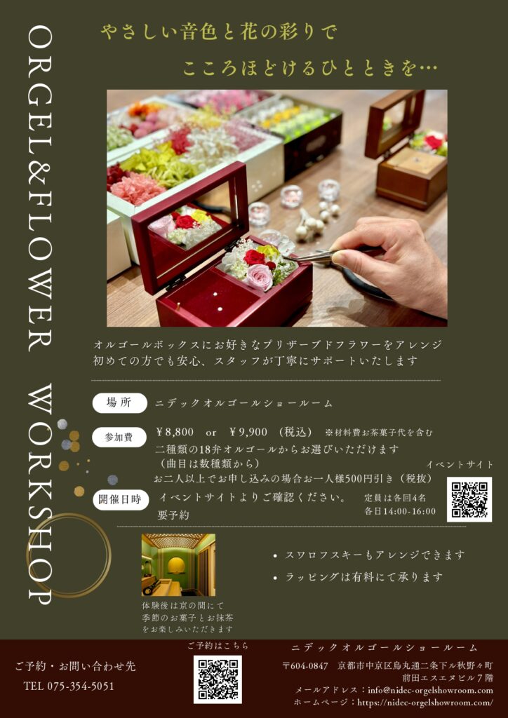 必要事項:「お名前・メールアドレス・お電話番号・オルゴール&フラワー ワークショップ」をご入力の上、お申し込みください。