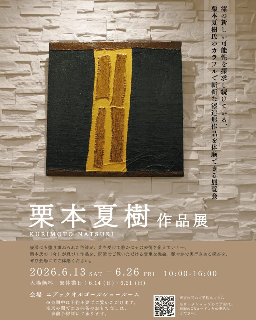 ニデックオルゴールショールームでは、京都を拠点に活動する漆造形作家・栗本夏樹氏による作品展を開催いたします。