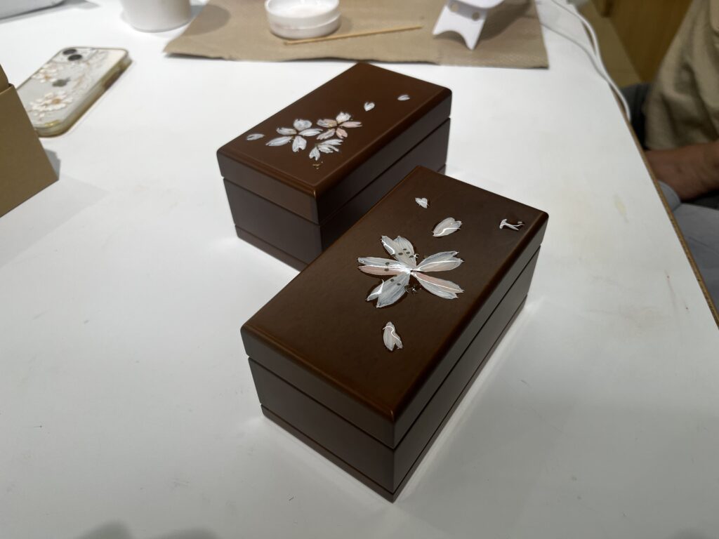 当日は、紙や木の板を使って筆づかいや絵付けの練習を行った後、木製オルゴール本体に桜を描いていただきました。奥村氏による丁寧なご指導のもと、それぞれ思い思いの色合いや構図で制作が進み、世界にひとつだけのオルゴールが完成しました。